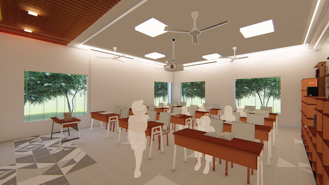 The design approach is pretty straightforward and simple. The client had framed the basic requirements and the design was done to sufficiently meet them.The intention to instill some tamil element in the interiors led to the use of Athangudi tiles which are colourful and as well as add charater to the interiors.Sufficient amount of sunlight was let into the building, the interiors were brightly lit using the natural as well as artificial light. The idea was to brighten up the interiors to create comfort in learning. The materials used in the interiors were mostly wood and gypsum. One other interesting element in the interiors is the design of handrails, the handrails were given some interesting patterns, so as to initiate the children to play around them, where the element acts as a catalyst in involving the children with their surroundings. The colour palette was mostly to pastel rainbow colours. The furniture in the classrooms included open racks, benches, all of the same colour palette. Another interesting feature in the interiors is that the partition walls between the classrooms are about 5’5” tall and the remaining is glass. The glass at the top helps in creating a continuity between the classrooms, it was provided to make the user feel that the ceiling extends throughout the entire floor without any disturbance. The lounge was to be spacious to accommodate seating for the parents to meet the teachers and discuss.