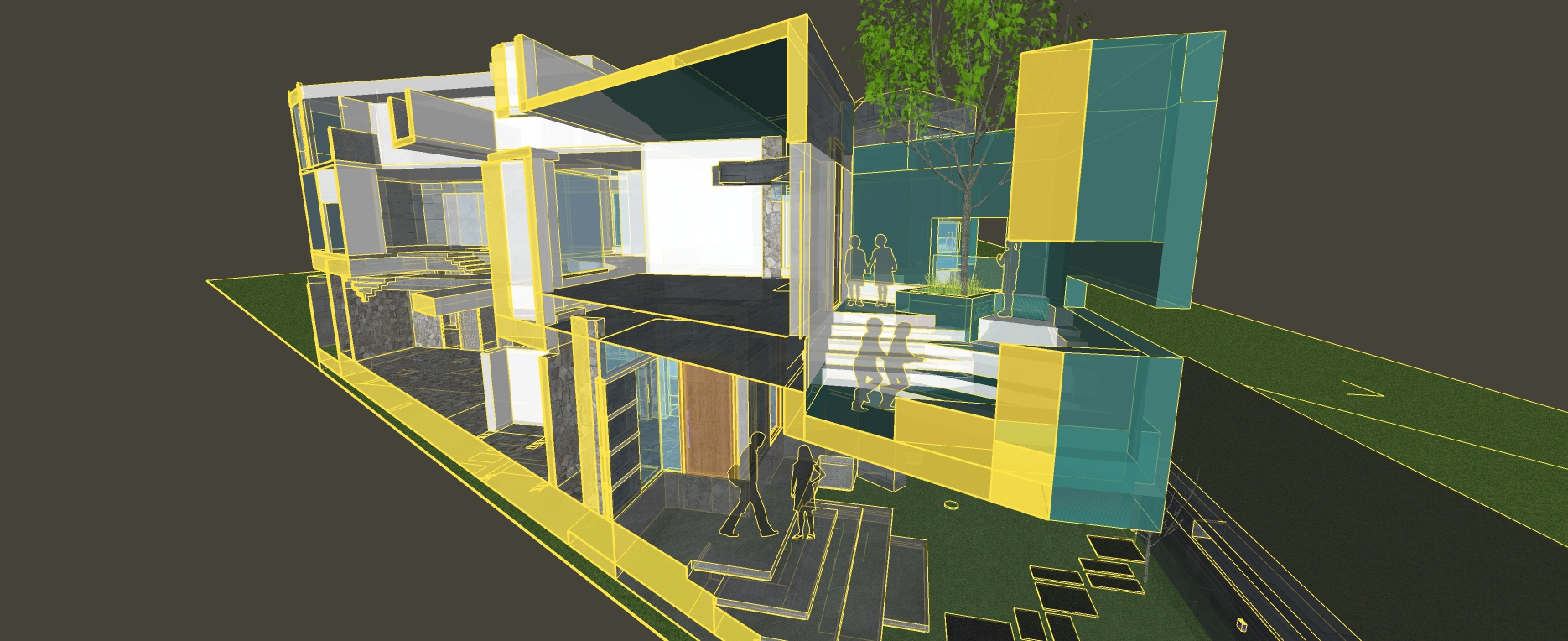 காட்சி வெளிப்படைத்தன்மையானது. இரட்டை உயர இடைவெளிகள் மற்றும் வீட்டின் குளம் மற்றும் பிற பகுதிகளுக்கு நேரடி காட்சிகளை வழங்கும் ஒரு பார்வை தளம் மூலம் உறுதிப்படுத்தப்பட்டுள்ளது. இரண்டு தனித்துவமான கனசதுரங்களை உருவாக்குவதன் மூலம், இயற்கையின் மத்தியில் ஏருதிடதன்மை நிறுவப்பட்டது. இவில்லமானது அதன் பயனர்களின் தன்மையை பிரதிபலிக்கும் வகையில் வடிவமைக்கப்பட்டு பரிசோதனை மற்றும் ஆராய்ச்சியின் எடுத்துக்காட்டாய் அரவணைப்புத் தன்மையுடன் உள்ளது.