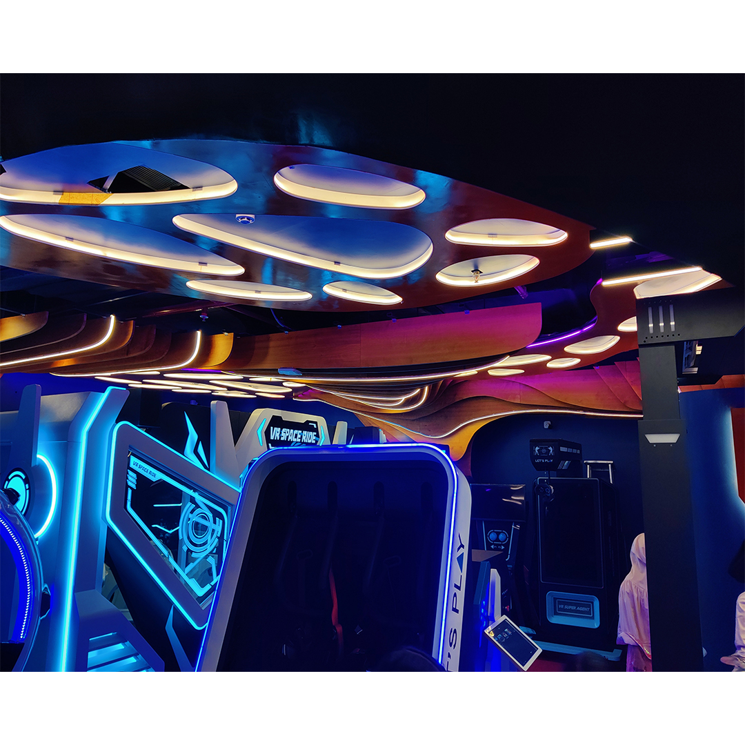 Every aspect of the interior space, from the vibrant hues to the flooring, ceiling, and wall panelling, embodies a futuristic aesthetic, meticulously curated to offer an unparalleled user experience. The cohesive fusion of design elements put together creates an ambiance that transcends the ordinary, fostering a memorable journey through the realms of virtual reality.