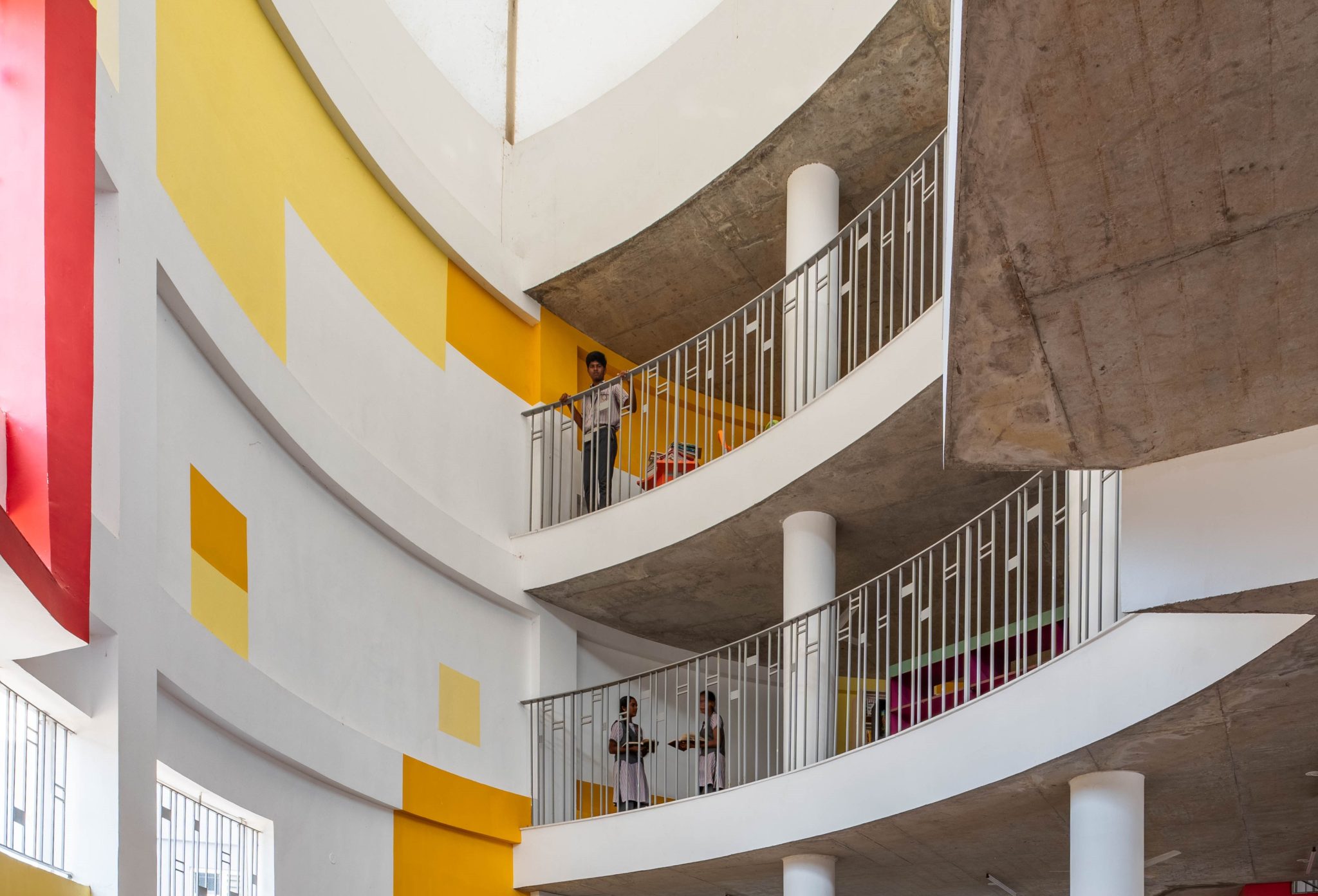 The story behind the project is one of deep social purpose. After discovering the school was for underprivileged children from surrounding villages with poor living conditions, Ar. Murali’s mission became clear: “The school should become like a heaven.” The design uses a “splash of colour everywhere” to elevate moods and bring happiness. “Colour always welcomes,” Ar. Murali explained. “It is like hugging you… It’s like holding you.” The result is a space where he says, “Every child loves it.”